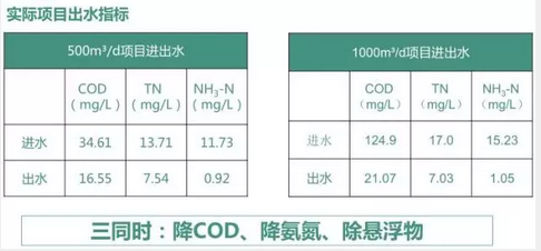 效果:處理生活污水時,系統(tǒng)出水水質(zhì)優(yōu)于《城鎮(zhèn)污水處理廠污染物排放標準》(GB18918-2002)一級A標準,其中CODcr、BOD5、氨氮可達到地表水Ⅳ類標準。